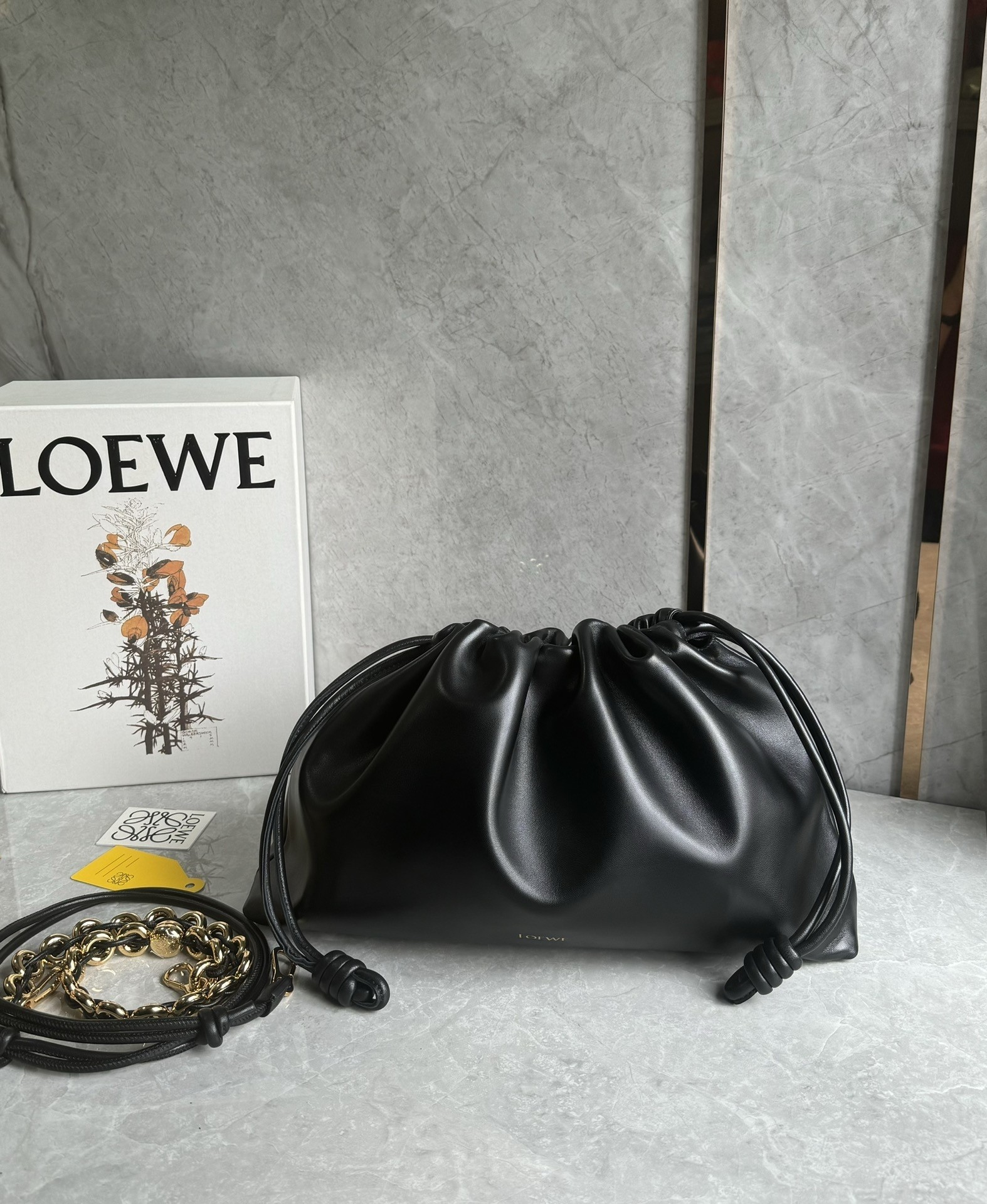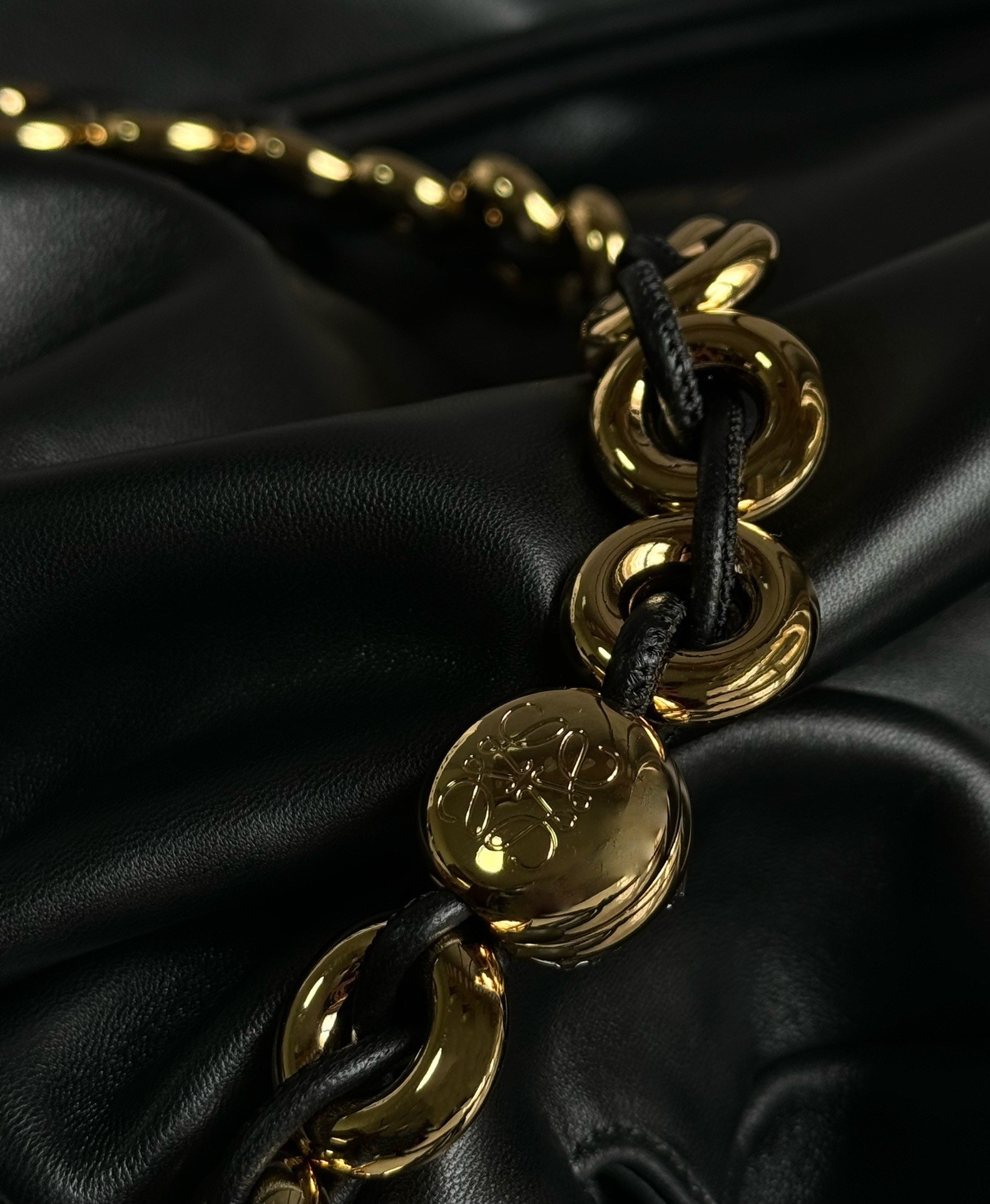 Introducing the exquisite Loewe large Flamenco purse, a masterpiece of design and craftsmanship. This lightweight and sumptuously soft bag, crafted from nappa lambskin, boasts a distinctive ruched shape. It features historical knot drawstrings, alongside a striking, detachable donut chain adorned with an elegant Anagram Pebble. A secure magnetic closure ensures your essentials are safe, while the gold embossed LOEWE logo subtly declares its heritage.